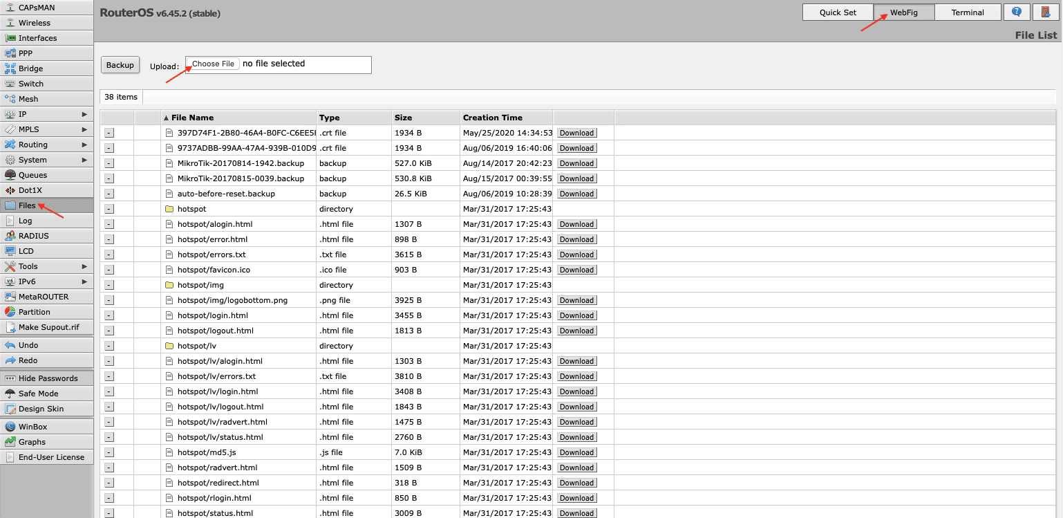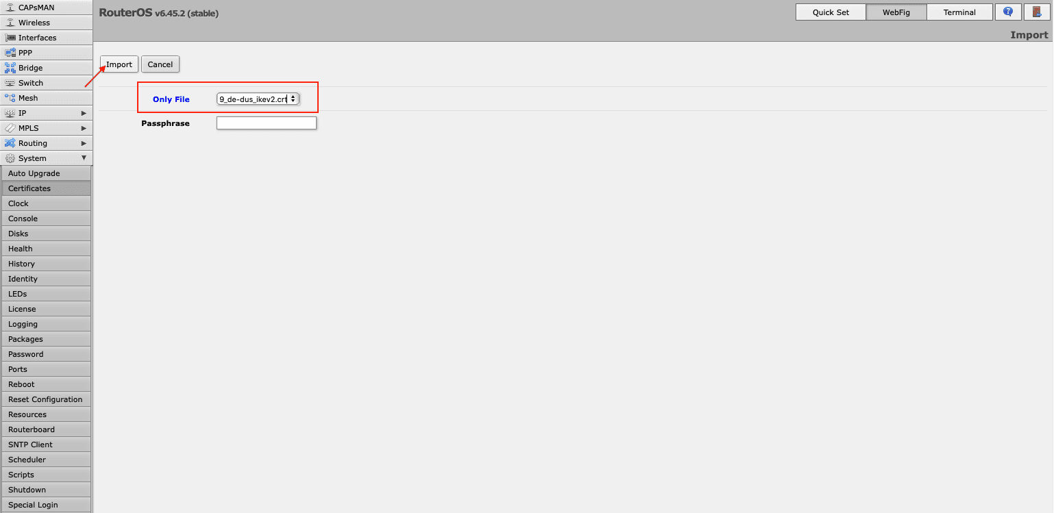 - System(システム)> Certificates(証明書)> Import(インポート)で証明書をインポートします。Only File(オンリーファイル)欄の隣のドロップダウンメニューから、先ほど追加した証明書を選択し、Import(インポート)をクリックします。