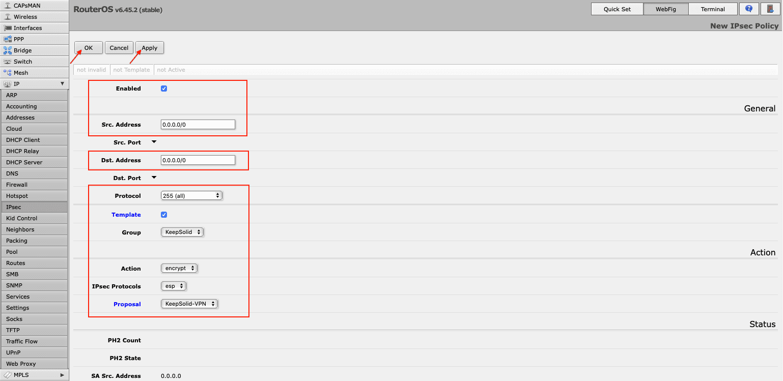 - ここで、Mikrotik ルーターに IPsec ポリシーを作成する必要があります。Policies(ポリシー)タブに移動し、Add New(新規追加)をクリックします。以下に示すようにフィールドに入力し、OKをクリックします。
