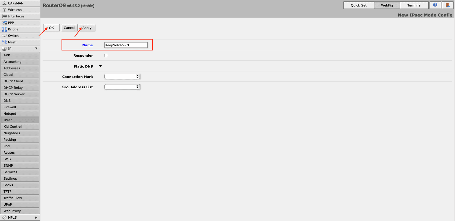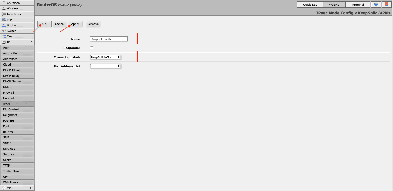- 同じIPsecセクションのMode Configs(モード構成)タブに進み、Add New(新規追加)を押します。設定の名称を入力し、Apply(適用)> OKをクリックします。
