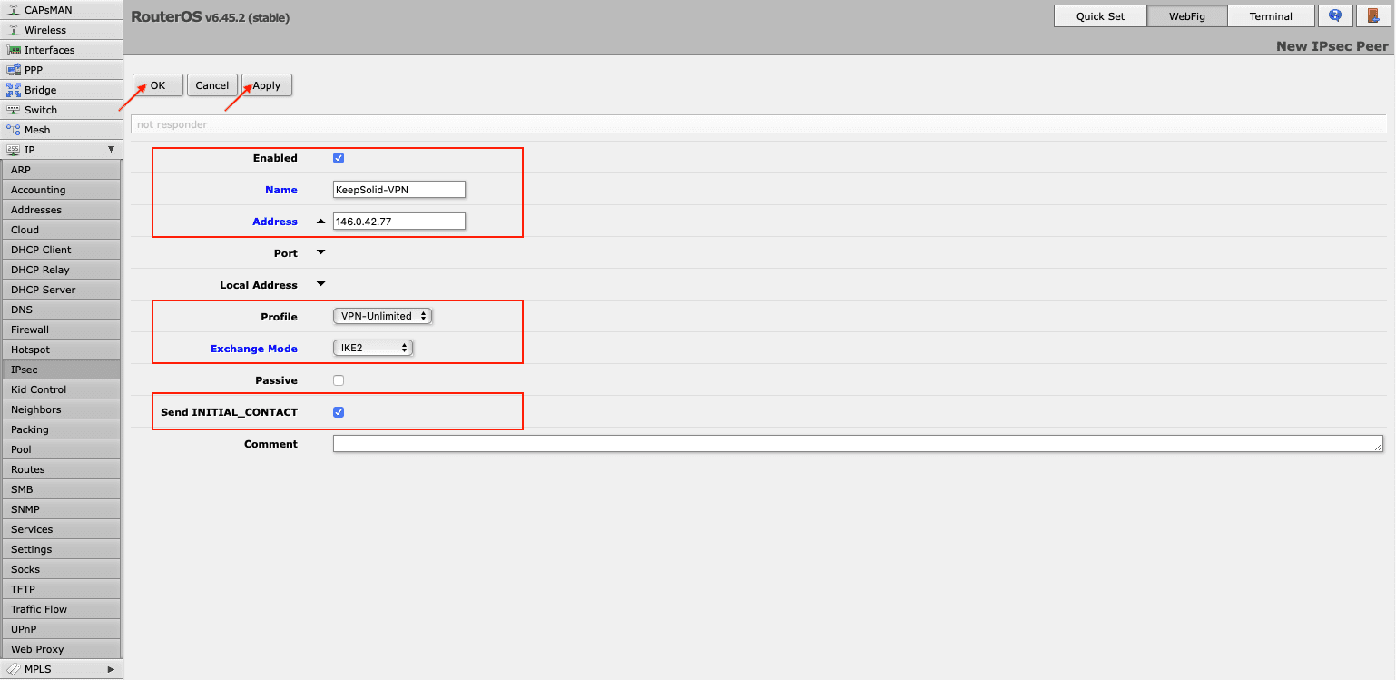 - Address(アドレス):選択したVPNサーバーのIPアドレスを入力します(生成した設定のIPSフィールドで見つけることができます)。