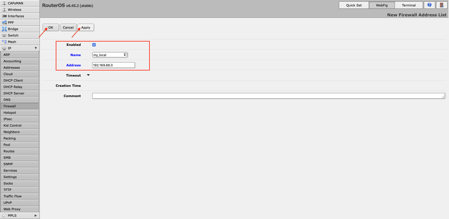 すべてのトラフィックをトンネルに送信するには、ローカルネットワークでアドレスリストを作成する必要があります。これには、Firewall(ファイアウォール)> Address Lists(アドレスリスト)に移動し、Add New(新規追加)をクリックします。Name(名称)フィールドで、ローカルネットワークを選択し、Address(アドレス)フィールドにそのIPアドレスとネットワークプレフィックス長を入力します。