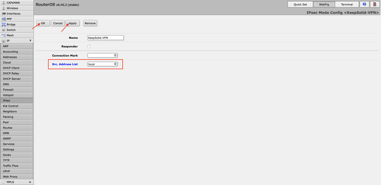 - ここで、このリストをモード構成に割り当てる必要があります。これには、IPsec > Mode Configs(モード構成)> KeepSolid-VPNと進み、Src.Address List(Src.アドレスリスト)フィールドの前にあるドロップダウンメニューで、先ほど作成したリストを選択します。