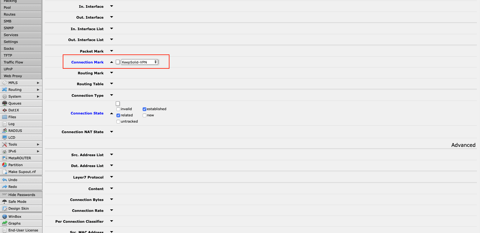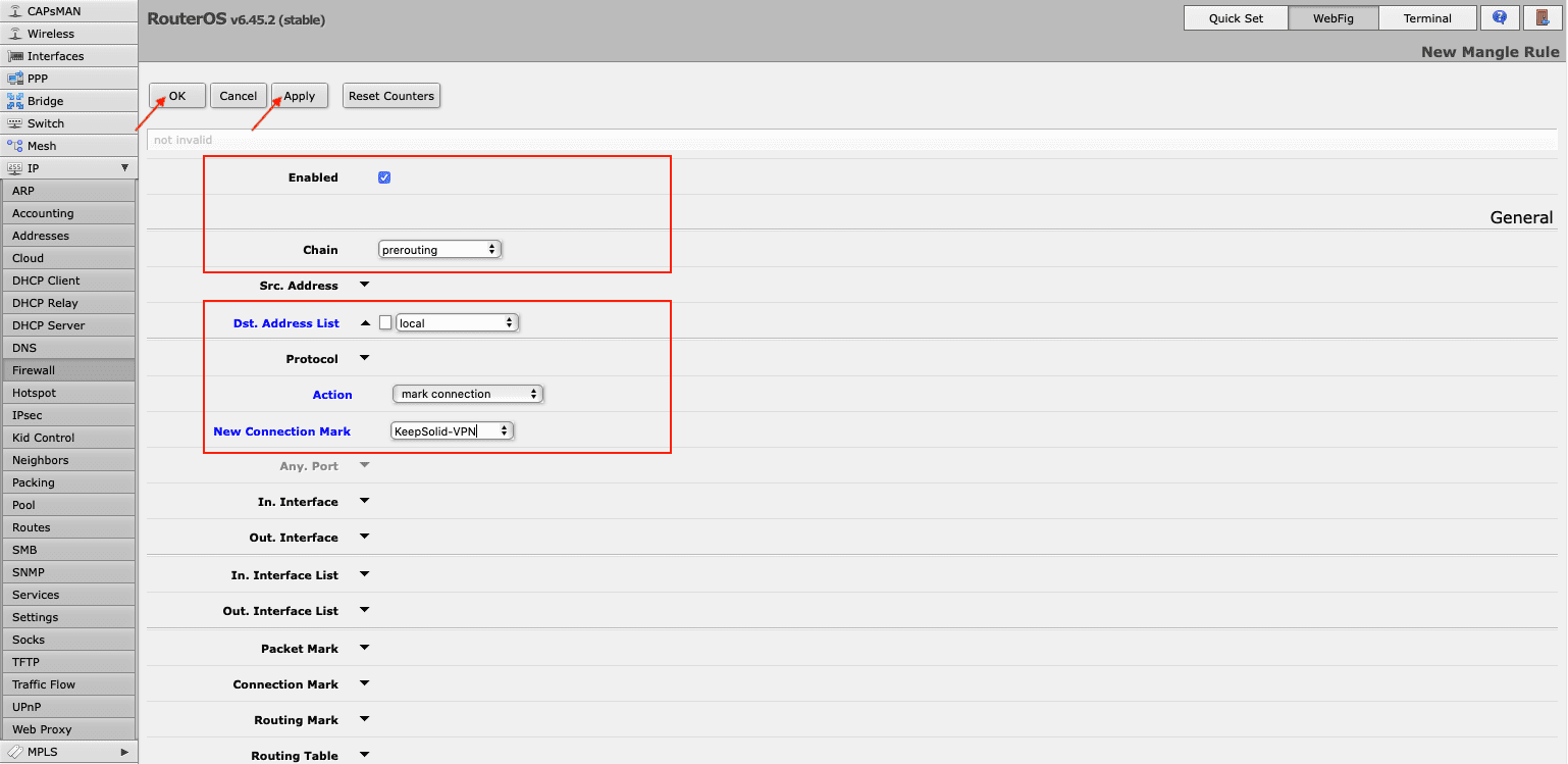 - Firewall(ファイアウォール)> Mangle(マングリング)でマングリングルールを作成します。Add New(新規追加)を押し、以下のように変更します。