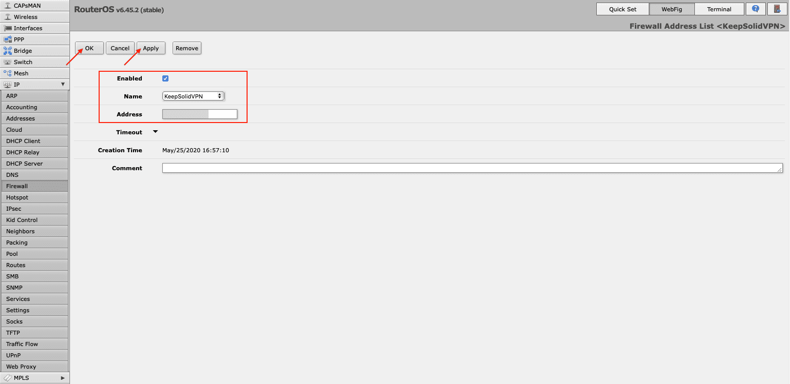 - Firewall(ファイアウォール)> Address Lists(アドレスリスト)で、Add New(新規追加)をクリックして、必要なIPアドレスをアドレスリストに含めます。