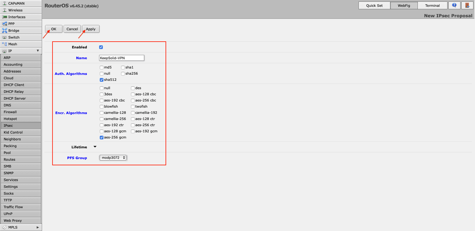 - 同じIPsecの画面で、Proposals(プロポーザル)タブを開き、Add New(新規追加)をクリックします。以下のようにフィールドを完成させます。