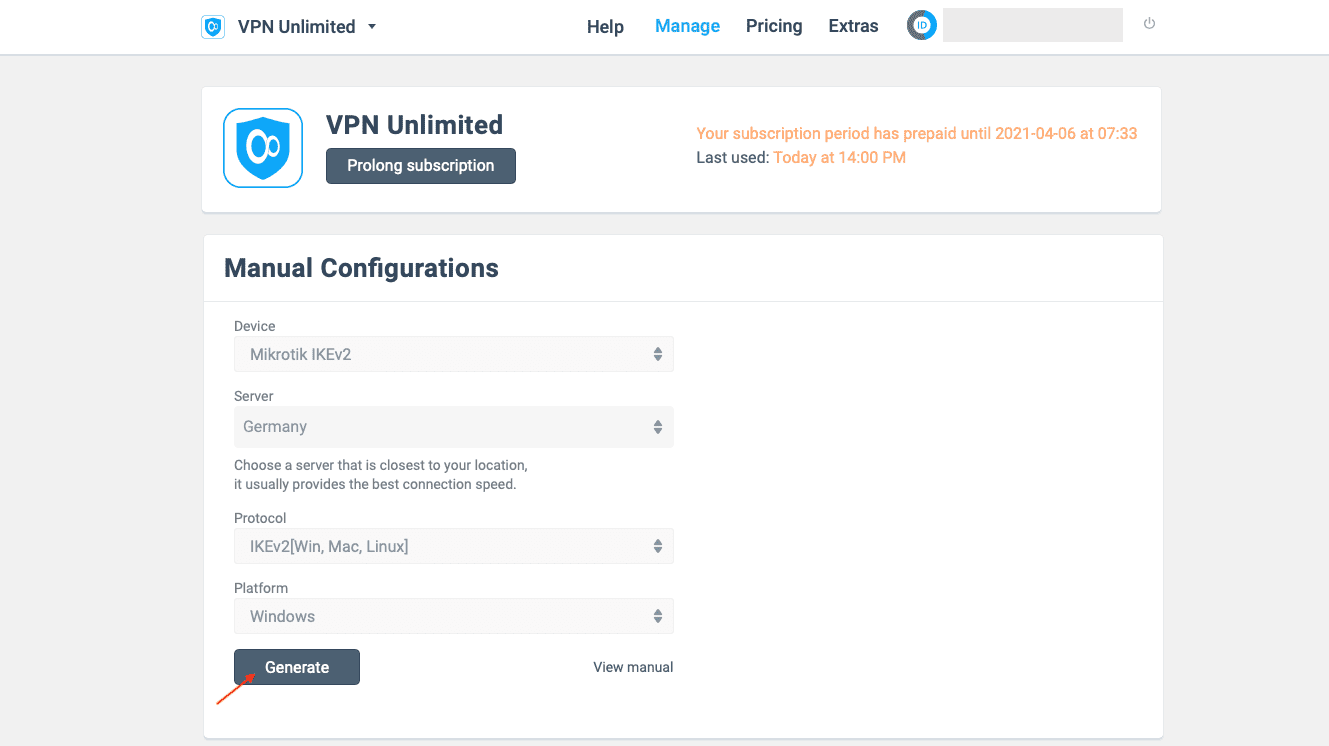 - Username(ユーザー名):生成された手動 VPN 設定の Login 欄の情報を入力します。