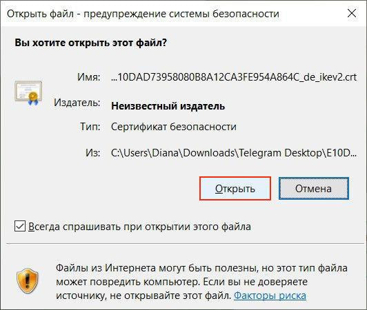1. Для начала вам необходимо установить сертификат безопасности, который был автоматически загружен во время настройки ручных VPN конфигураций в вашем Личном кабинете. Дважды нажмите на файл сертификата с расширением .crt и нажмите Открыть.