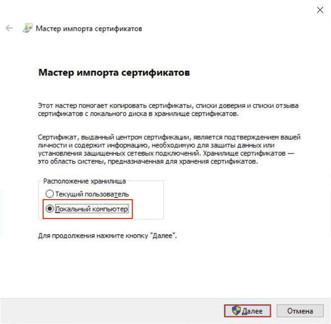 1. Выберите Доверенные корневые центры сертификации и нажмите ОК. Затем нажмите Далее.