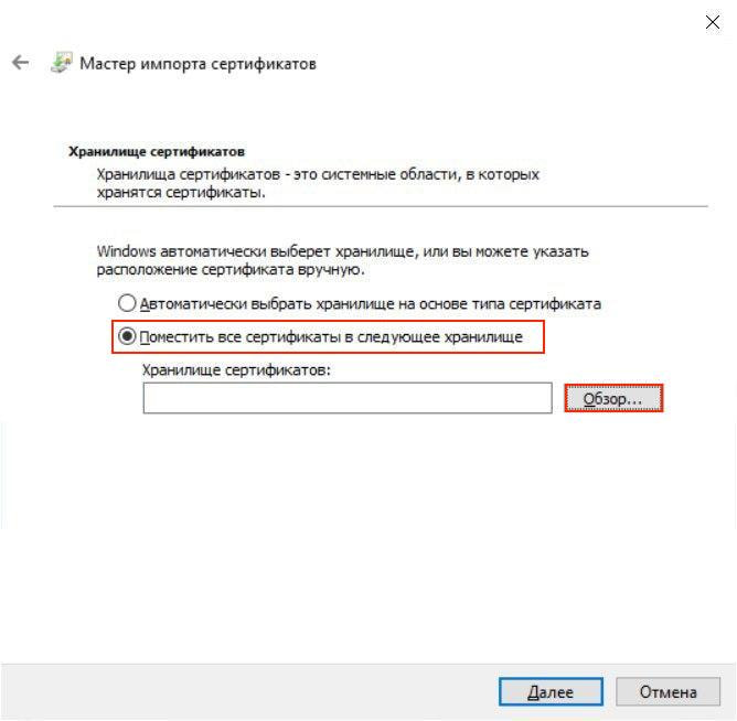 2. Выберите опцию Поместить все сертификаты в следующее хранилище и нажмите Обзор...