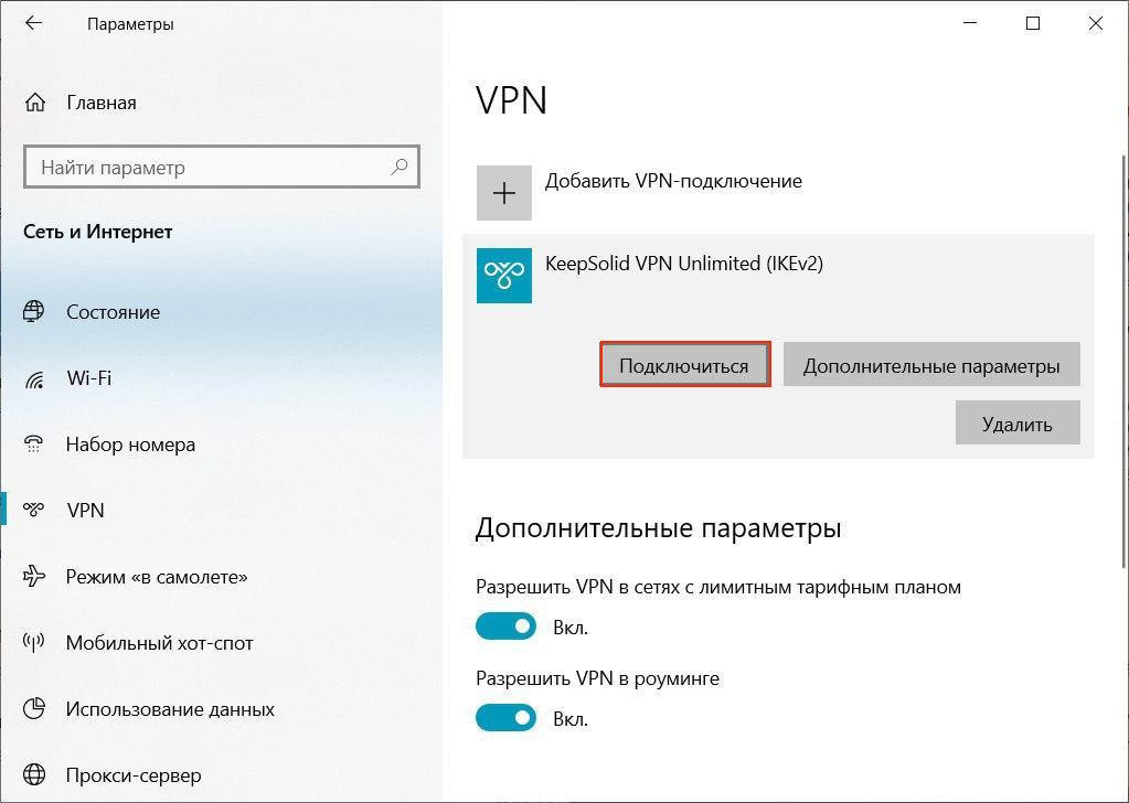 1. Чтобы установить IKEv2 VPN соединение нажмите кнопку Подключить.