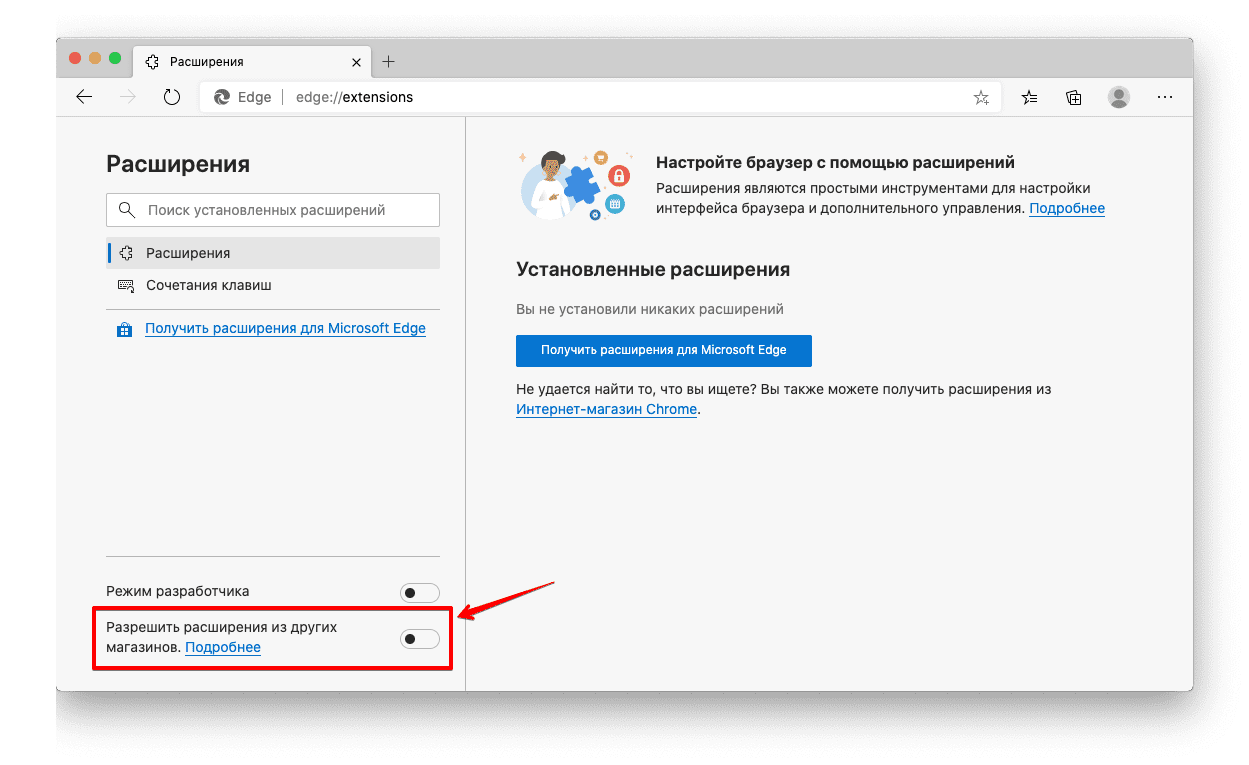 3. Включите опцию Разрешить расширения из других магазинов.
