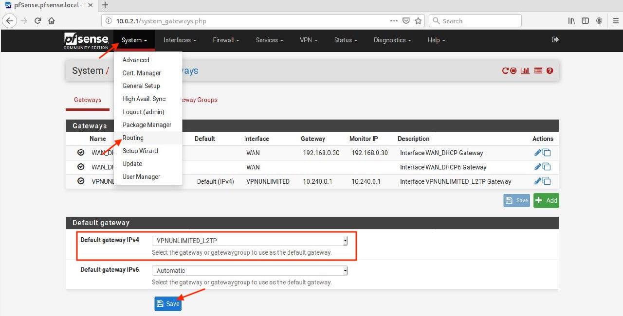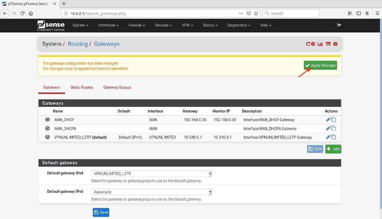 10. Go to the System tab > Routing and select VPNUNLIMITED_L2TP for the Default gateway IPv4 option.