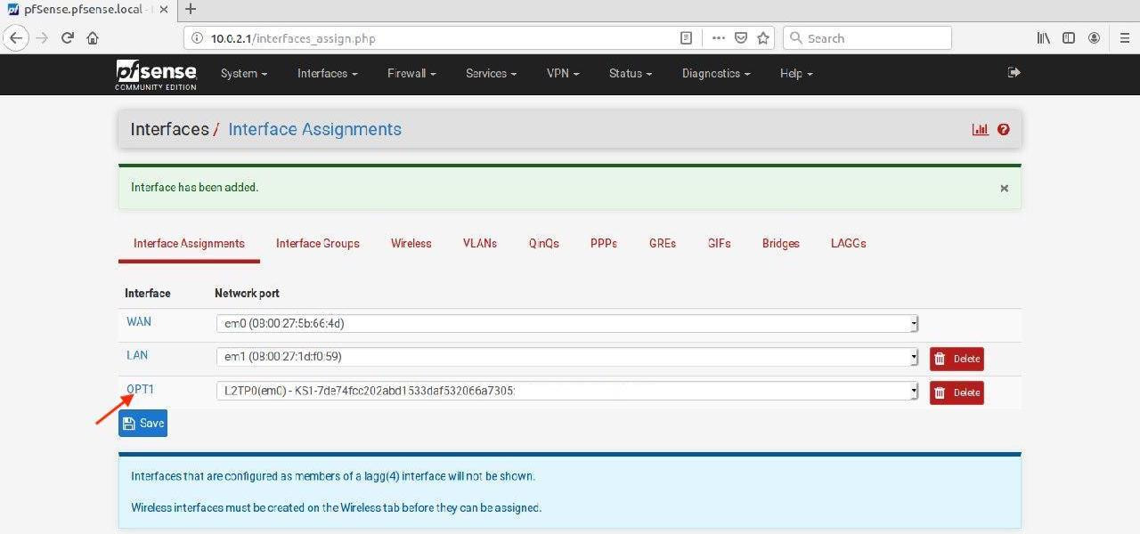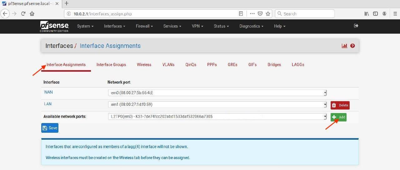 3. Go to the Interface Assignments tab, select L2TP option for Available network ports and click +Add.