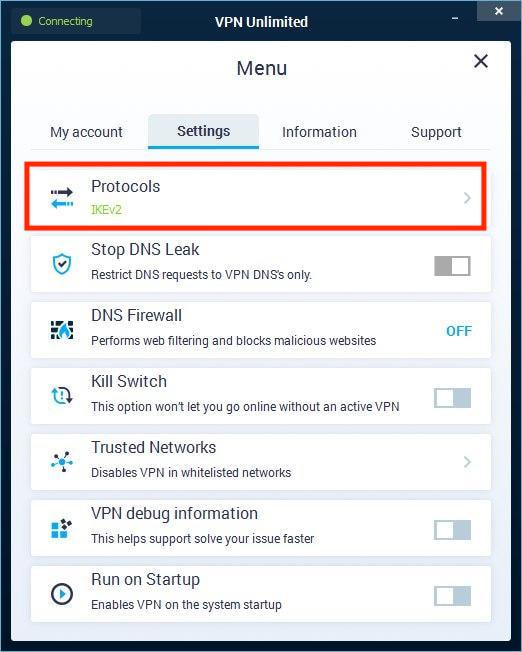 Note: If your VPN connection is active it will be automatically re-connected using the chosen VPN protocol.