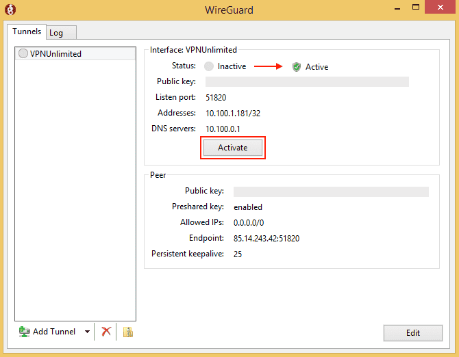 1. Press the Activate button. Now your secure WireGuard® VPN connection is established.