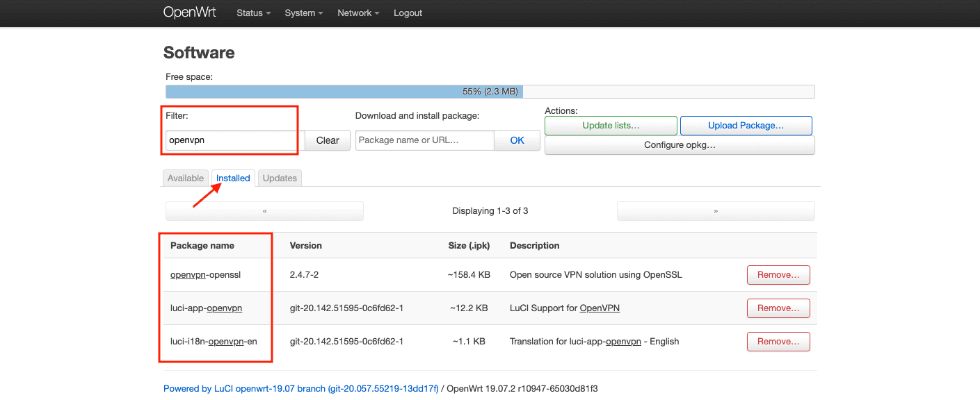8. 确保所有程序包都已成功安装。为此,请选取 Installed(已安装)选项卡并在 Filter(过滤器)栏输入 openvpn。