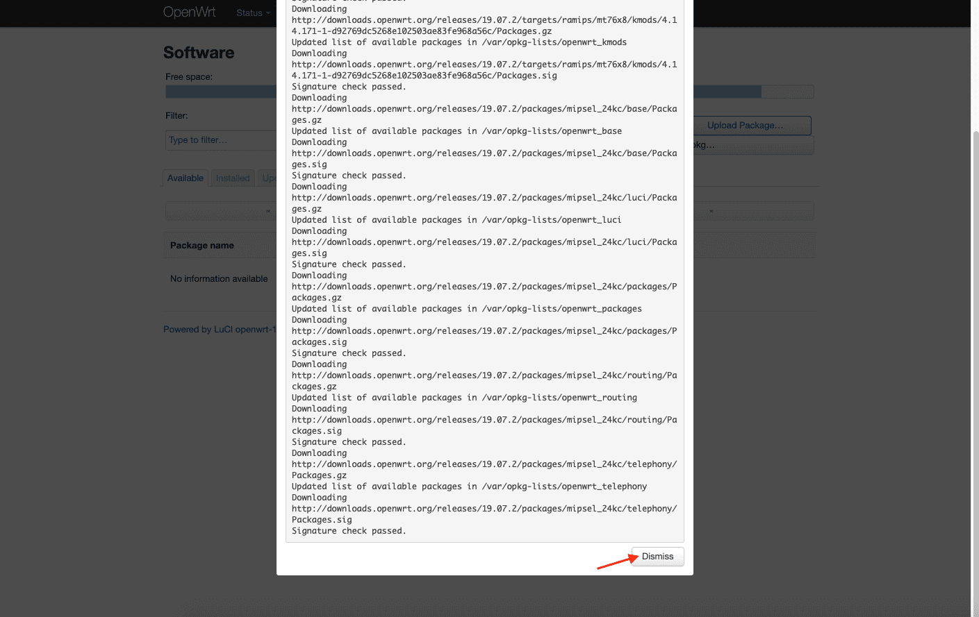7. 等待两个程序包都安装完毕,点击 Dismiss(离开)。