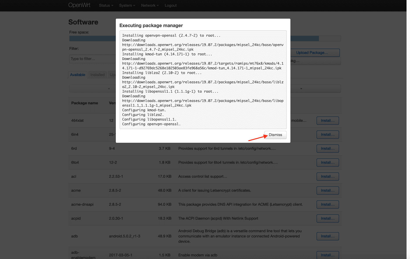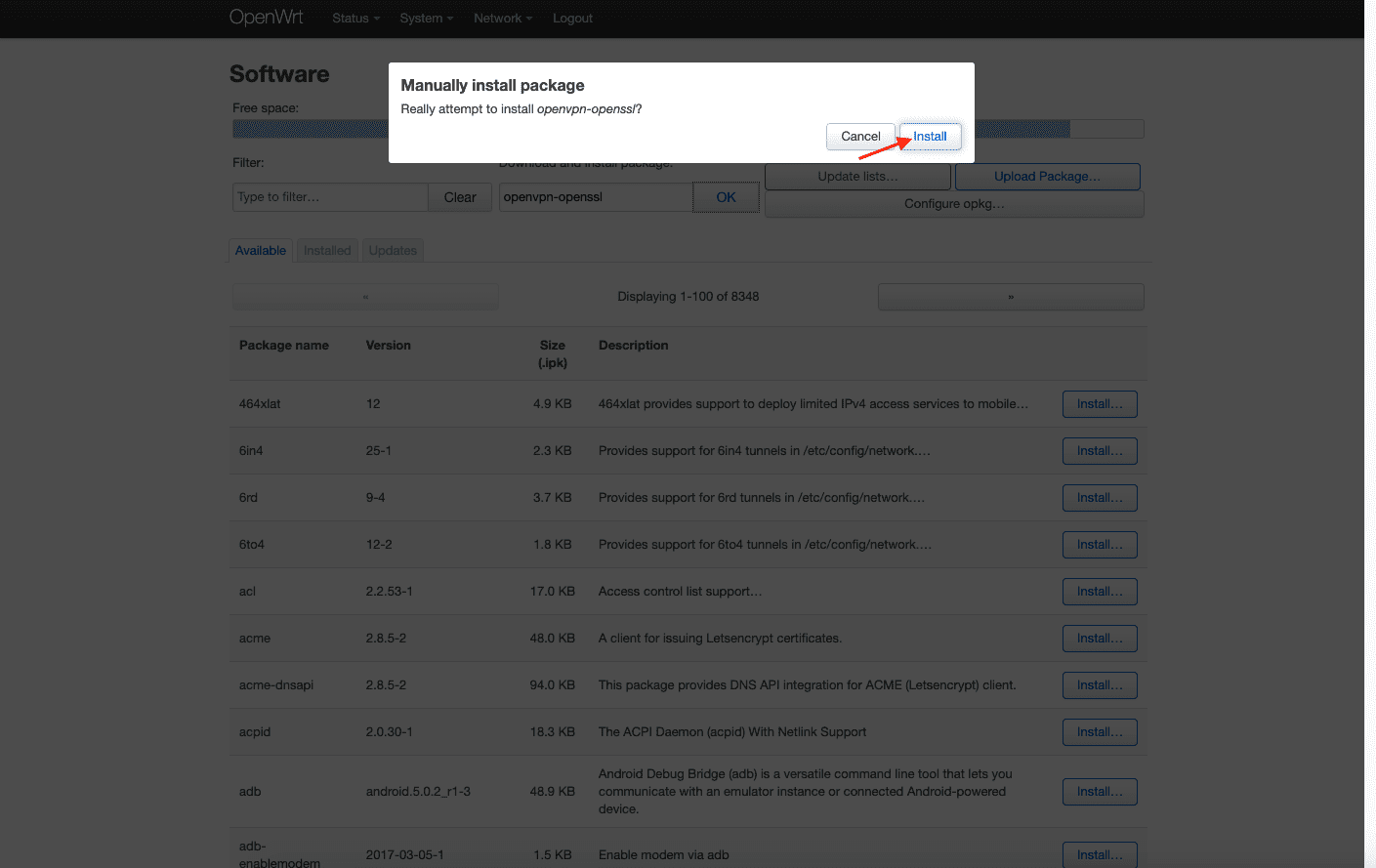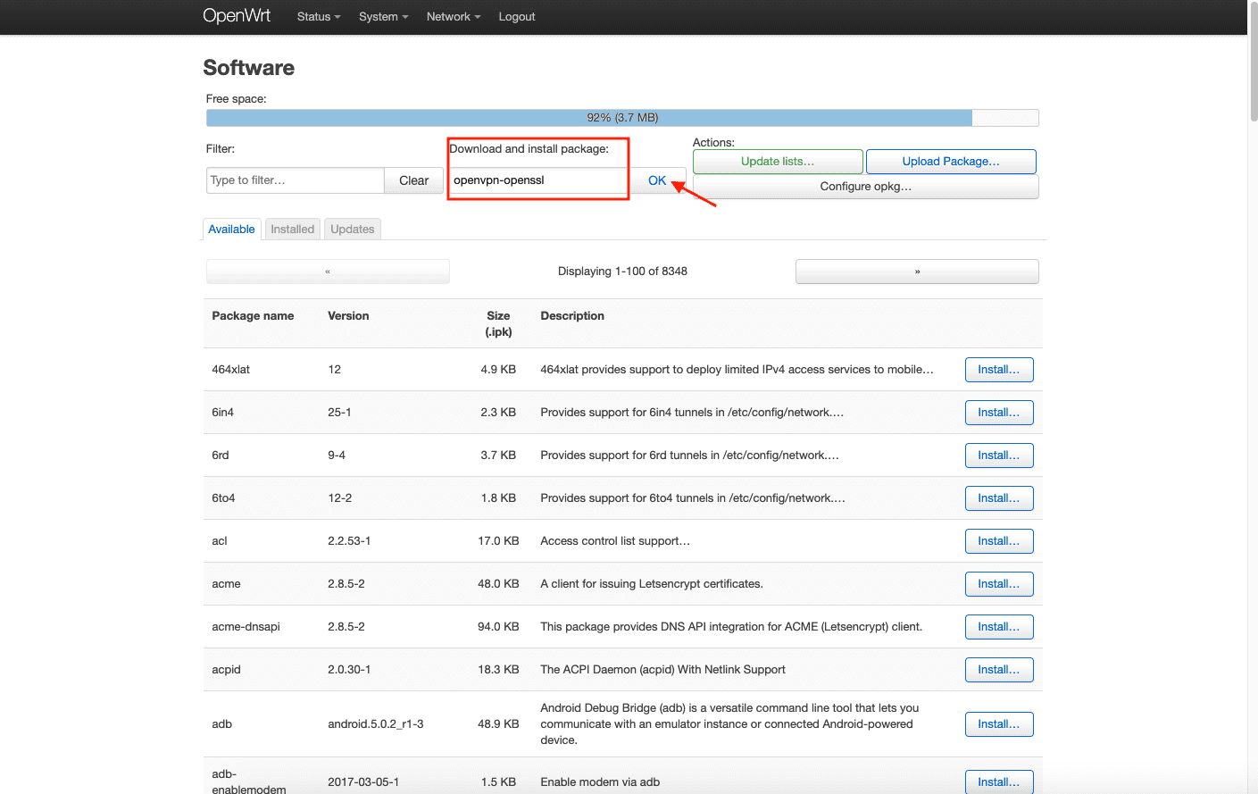 3. 在 Download and install package(下载和安装包)字段中输入 openvpn-openssl 并点击 OK。