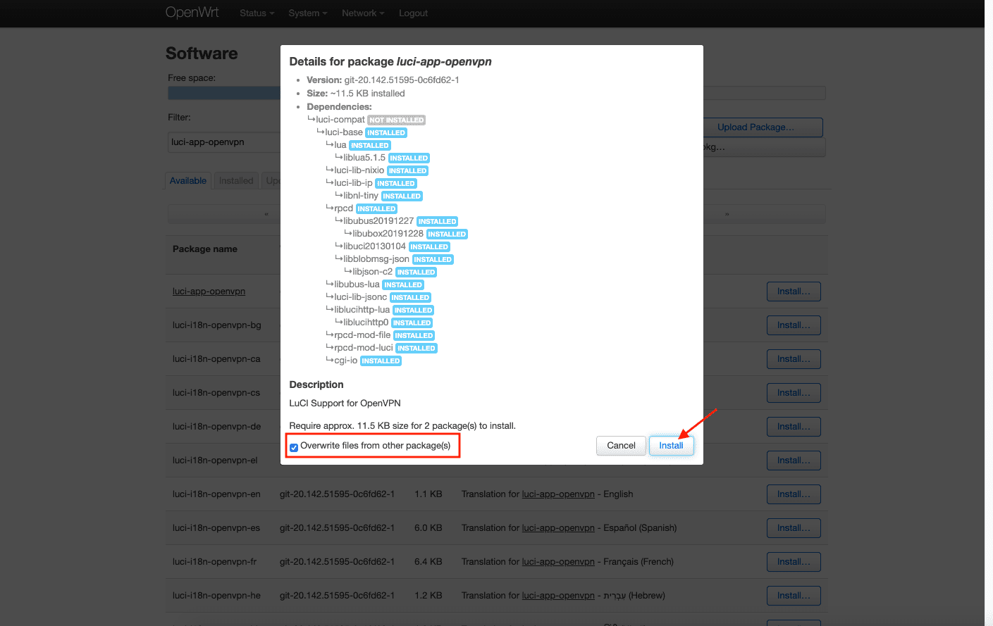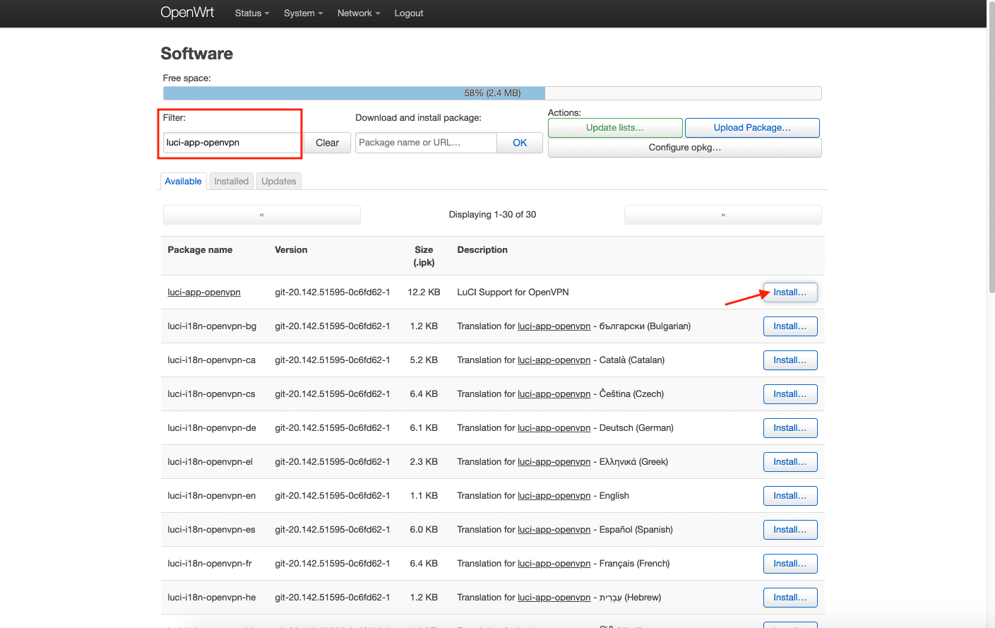 然后在 Filter(过滤器)栏输入 luci-i18n-openvpn-en 并点击 Install(安装)。