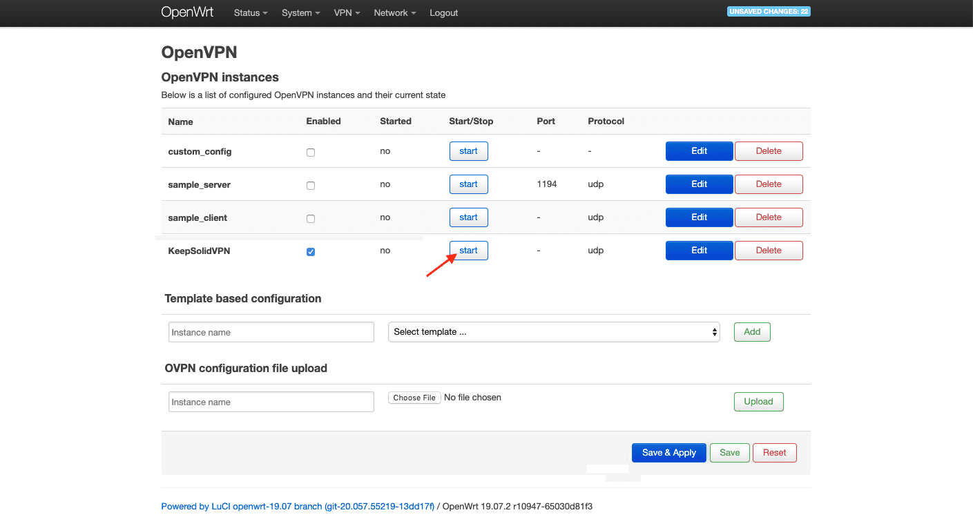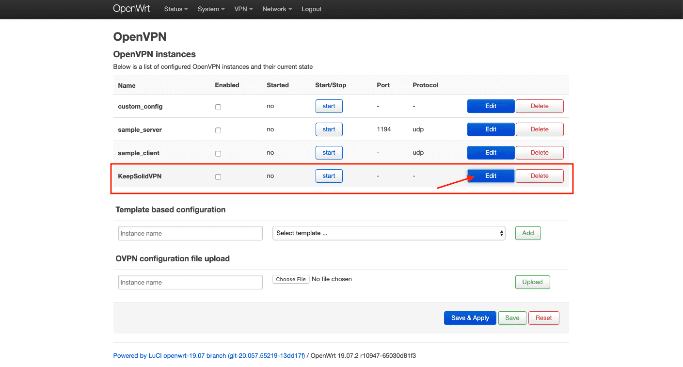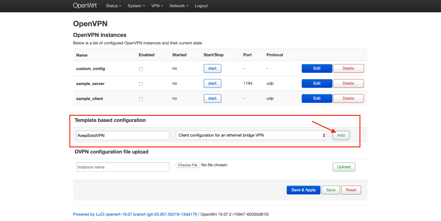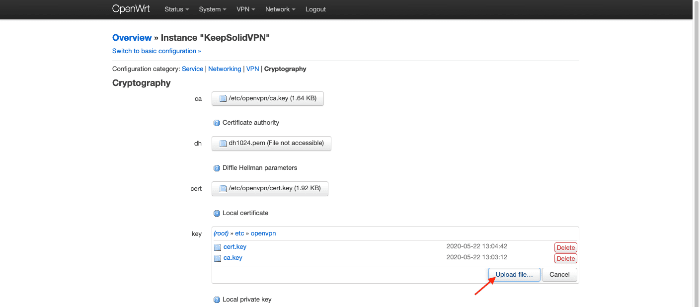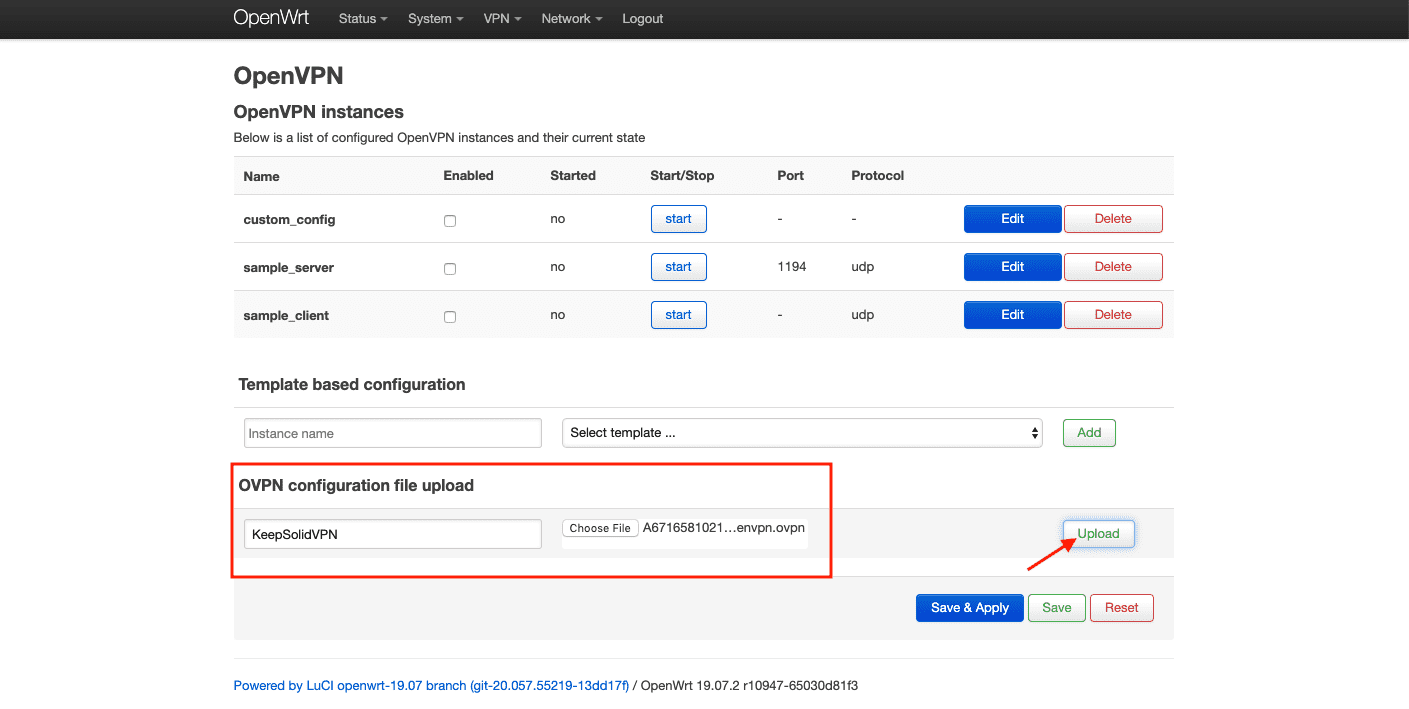 2. 找到 OVPN 配置字段,为它指定一个自定义名称(如 KeepSolidVPN),然后选择从您的 用户主页 自动下载的 .ovpn 文件。接着点击 Upload(上传)。