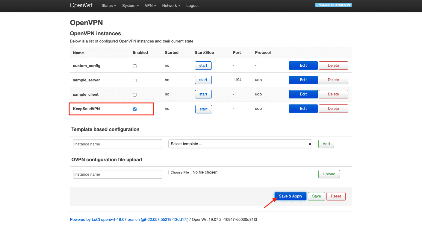 14. 为 KeepSolidVPN 勾选 Enabled(启用),然后点击 Save & Apply(保存和应用)。
