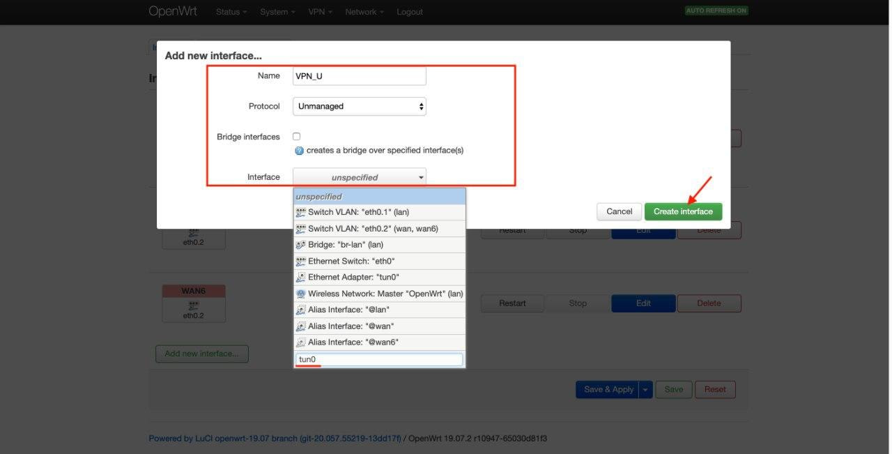 - Interface(接口):Custom Interface(自定义接口): tun0