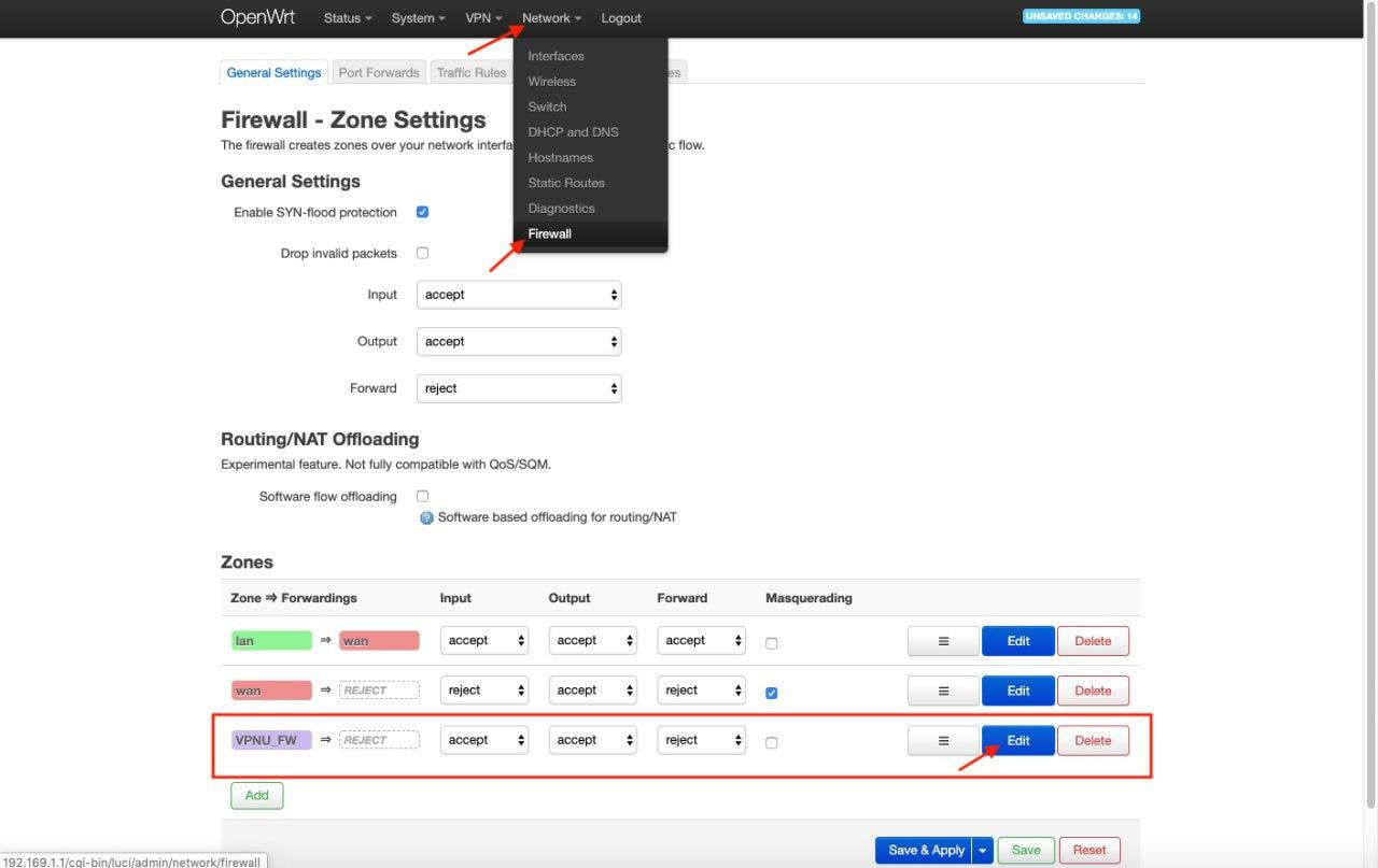 11. 前往 Network(网络)> Firewall(防火墙),选中 VPNU_FW 然后点击 Edit(编辑)。